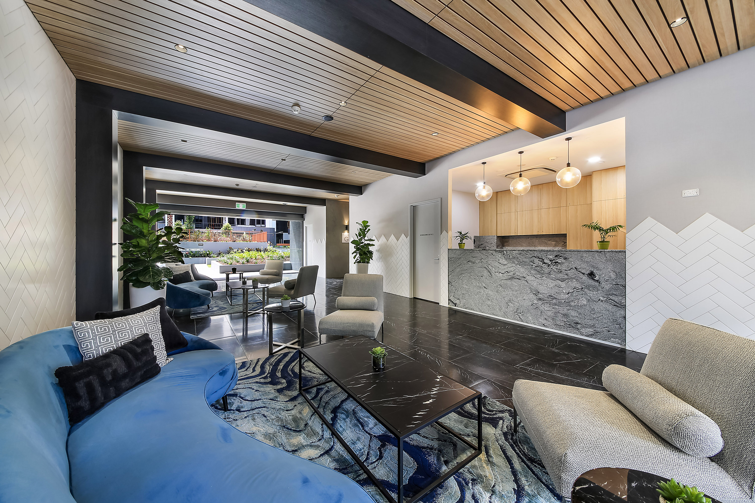 -Modern, timber look tiles throughout the combined lounge & dining area