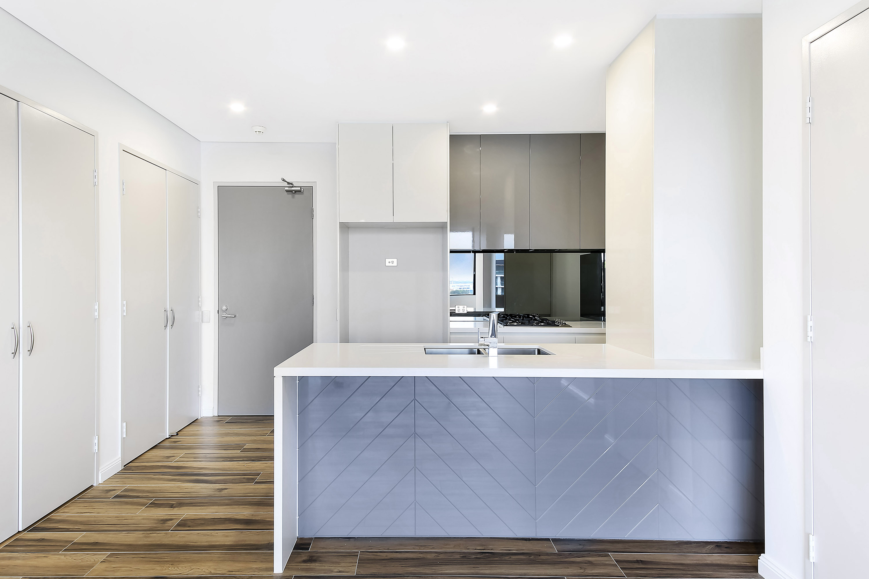 -Designer kitchen with stone benchtops, premium appliances & stunning mirrored splashback