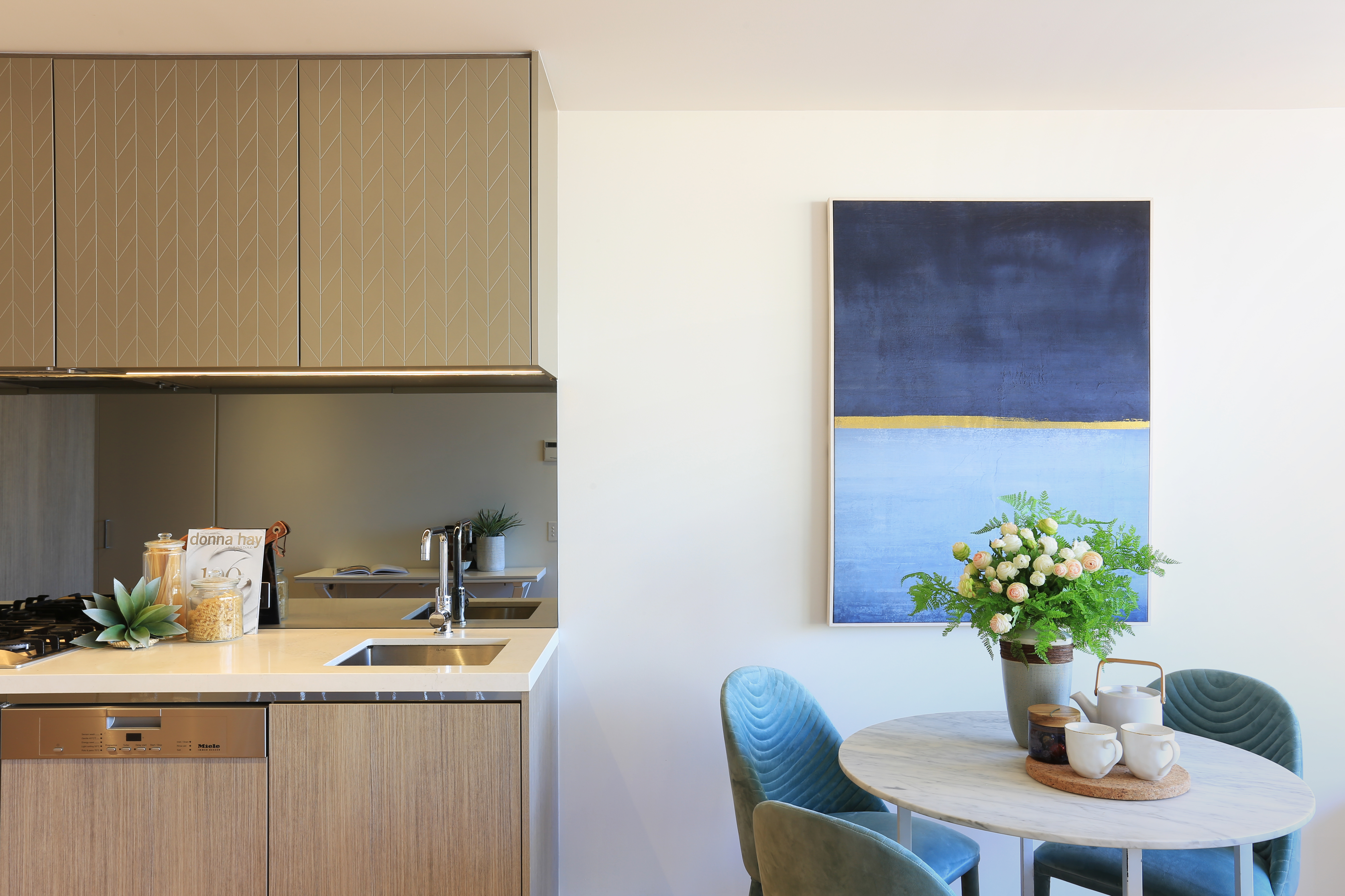 - Sleek gas kitchen w stone benchtop, textured cabinets & MIELE appliances